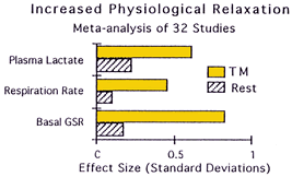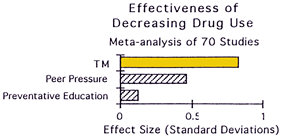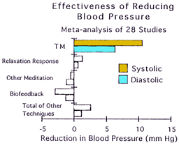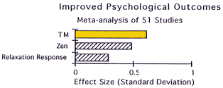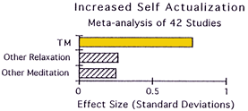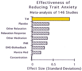 The results of eight meta-analyses on a grand total of 597 studies have found that Maharish's Transcendental Meditation technique is more effective than other meditation/relaxation techniques and programs in reducing trait anxiety, reducing blood pressure, producing deep physiological relaxation, increasing self-actualization, improving psychological outcomes, and decreasing cigarette, alcohol and drug use. (Data from Table 1, Orme-Johnson & Walton, 1998) |